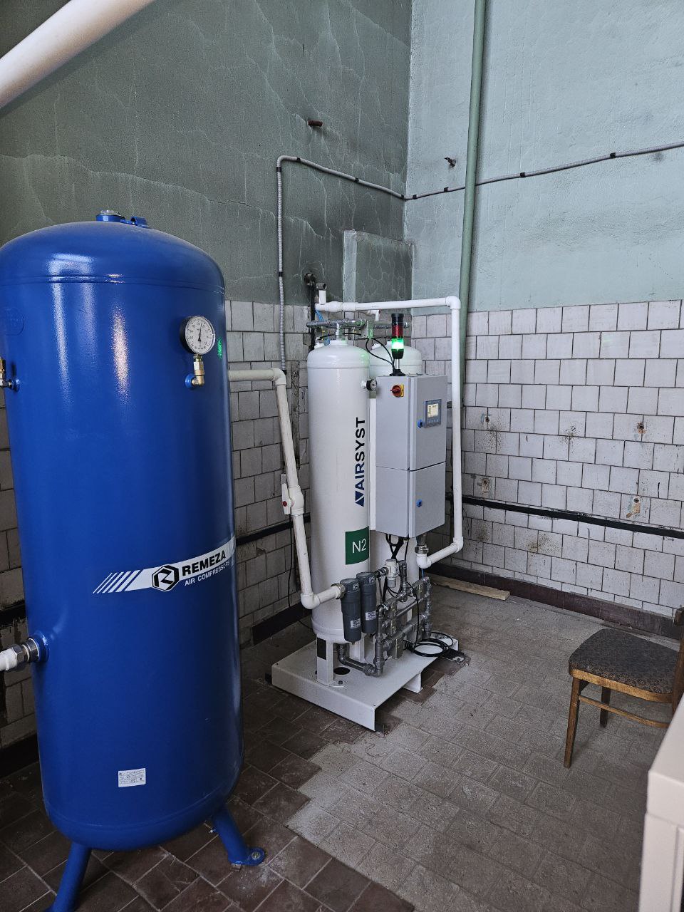 Азотная станция для подачи азота чистотой 99,999% в печи. Поставка под ключ. с Шефмонтажными и пусконаладочными работами. Компрессоры на постоянных магнитах с частотным регулированием. Особенность проекта: контроль чистоты азота в ресиваерах с азотом, непосредственно около потребителя. Расстояние от азотной станции до потребителя более 300 м за пределами зданий. Благодаря точки росы по азоту в -55%, в азотоной магистрали не образовывается конденсат. В станции используются 2-а компрессора 11 кВт. Один основной, второй резервный. Режим работы станции круглосуточный 365 дней в году. ВИДЕО СТАНЦИИ МОЖНО ПОСМОТРЕТЬ ПО ССЫЛКЕ https://disk.yandex.com/i/o3nW-CDld_SGbw